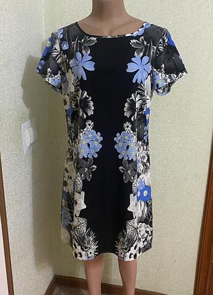 Гарна, неймовірно легка, шифонова сукня на літо. Цікавий принт. Короткий рукав. По грудям є витачки. Застібається позаду на ґудзик. За рахунок крою плаття гарно сідає по фігурі. Заміри: пог 52, пот 48, поб 55, довжина рукава 17, довжина 85