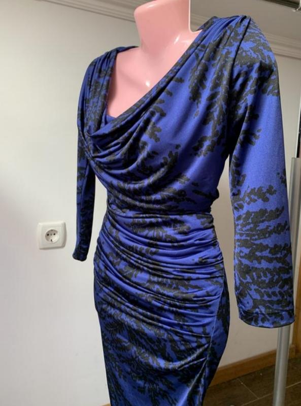 В ідеальному стані гарне жіночне плаття. Тканина поліестер стрейч. Приємна до тіла. Підкреслює гарно фігуру. Гарно оформлено на грудях "водичка". Розмір М. Довжина міді.