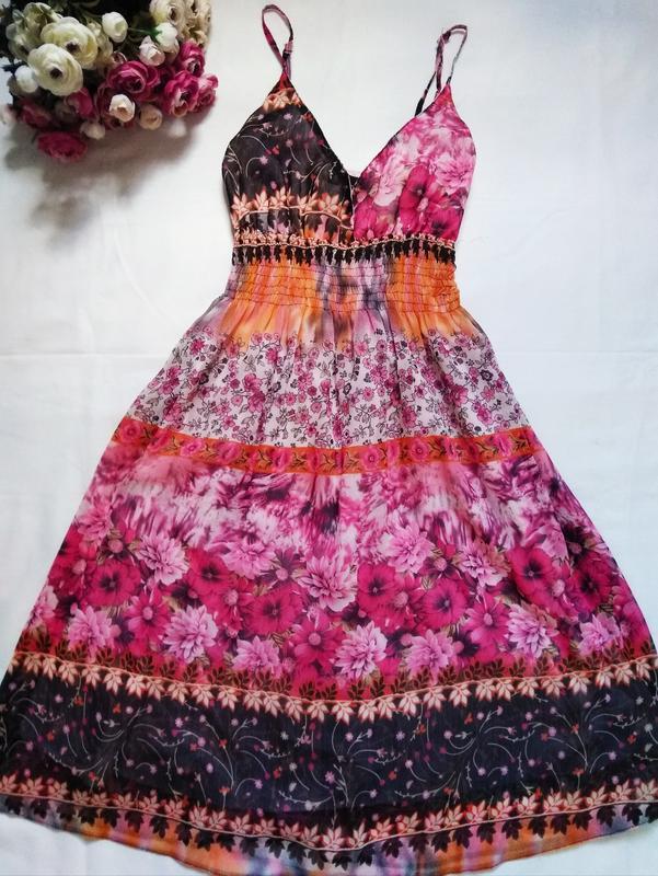 Гумка під грудьми. Довжина залежить від того, як розпущені бретельки, 90 см від того місця, де бретельки кріпляться до ліфа. На тонкій бавовняній підкладці.