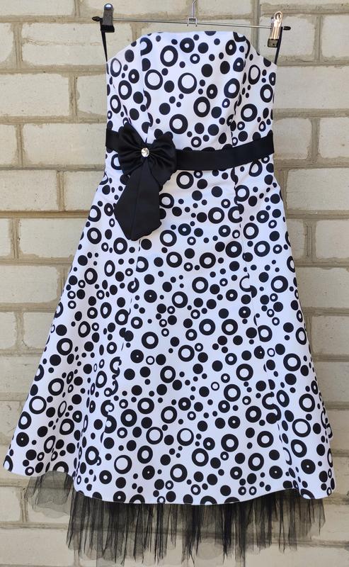 Біле плаття А-силует з чорним абстрактним геометричним принтом. Талія стягується корсетом. Довжина міді десь на долоню нижче коліна. Підійде на розмір S-M. Напівобхват грудей 41см (можна стягнути шнурівкою корсету) Напівобхват талії 35см Довжина спереду 81см (+фатин)