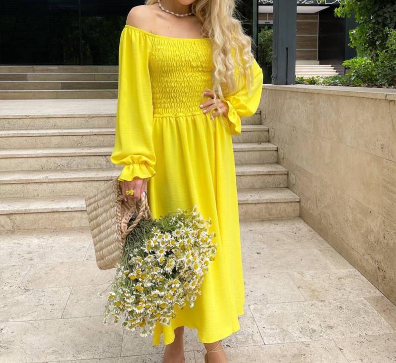 Идеальное легкое платье на резиночке. Подойдет под любую обувь. Можно носить с закрытым и вскрытым плечом. Платье в самых тонких цветах. Фото реальные. Тканина: креп жатка. Размерный ряд: 42-46, 48-52. Цвета: малина, лимон, зеленый, электрик.