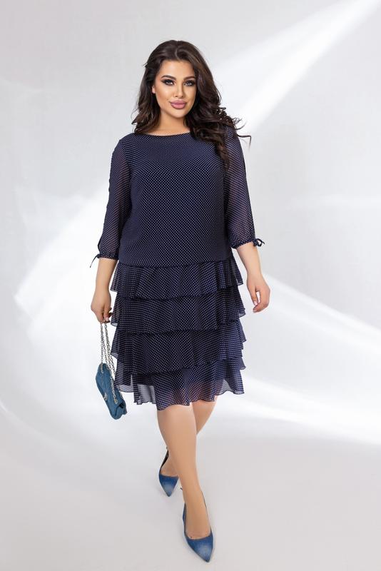 Сукня Розміри 48, 50, 52, 54 Тканина шифон, трикотажна підкладка Склад: поліестер 100% Кольора синій, чорний Розтяжнісь: слабка розтяжність (0-1 см) Орієнтовні заміри готового виробу: 48 р-р: довжина сукні 105см, довжина рукава від плечового шва 44см, обхват рукава 34см, ОГ - 96см, ОТ -100см, OC -110см. 50 р-р: довжина сукні 105см, довжина рукава від плечового шва 44см, обхват рукава 36см, ОГ - 100см, ОТ -104см, OC -114см. 52 р-р: довжина сукні 105см, довжина рукава від плечового шва 44см, обхват рукава 38см, ОГ - 104см, ОТ -108см, OC -120см. 54 р-р: довжина сукні 105см, довжина рукава від плечового шва 44см, обхват рукава 40см, ОГ - 108см, ОТ -112см, OC -126см. mar