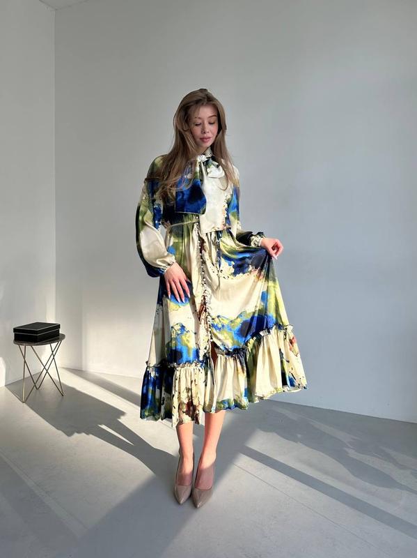 Ніжна сукня в довжині міді, з акцентним бантом у 5-ти кольорах🌺 Мод: 2328 Колір: чорний, білий, синій, зелений, бронза Розмір: універсал 42-46 Тканина: шовк Армані Ціна 1500грн