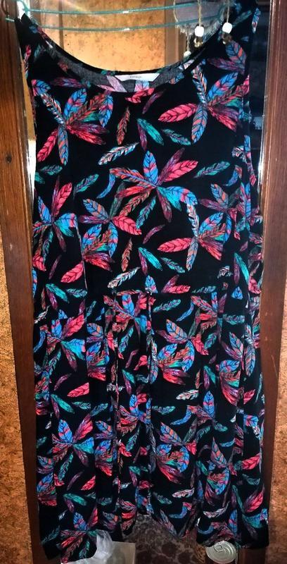 Тип одягу: Плаття Колір: Інший колір Торг Класна, зручна сукня чорного кольору з тропічним принтом до середини бедра. Можна підкреслити талію завдяки вшитій стрічці в цій зоні, або комбінувати з будь - яким ремнем на ваш смак. Стан майже ідеальний, із недоліків тільки трохи ростягнуті отвори для стрічки (котрі без проблем можна вшити при бажанні). Та на тілі їх зовсім не видно. Розмір l-xl.