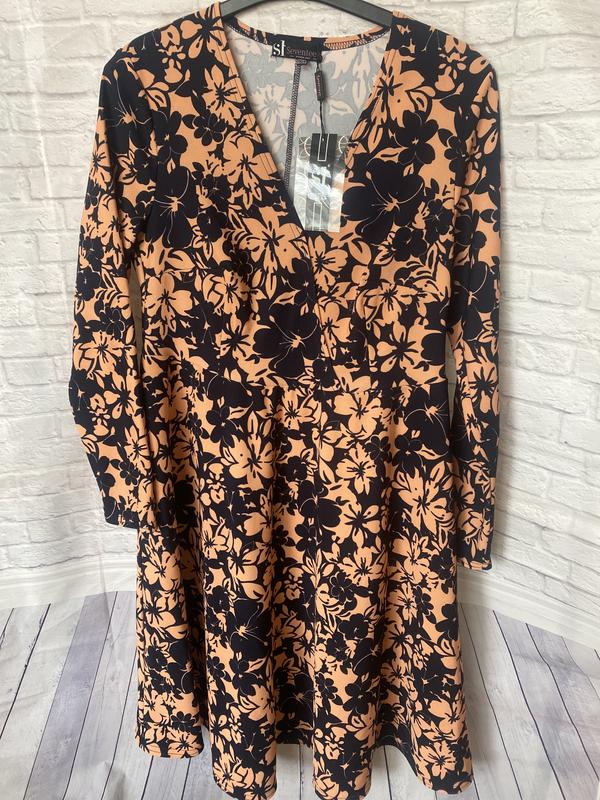 Платье с V вырезом, миди. Ткань полиестр, коттон, вискоза. Цвет персик и цветочным принтом. Замеры: ОГ 86 см. ОТ 90 см. Длина платья 104 см. Длина рукава 60 см.