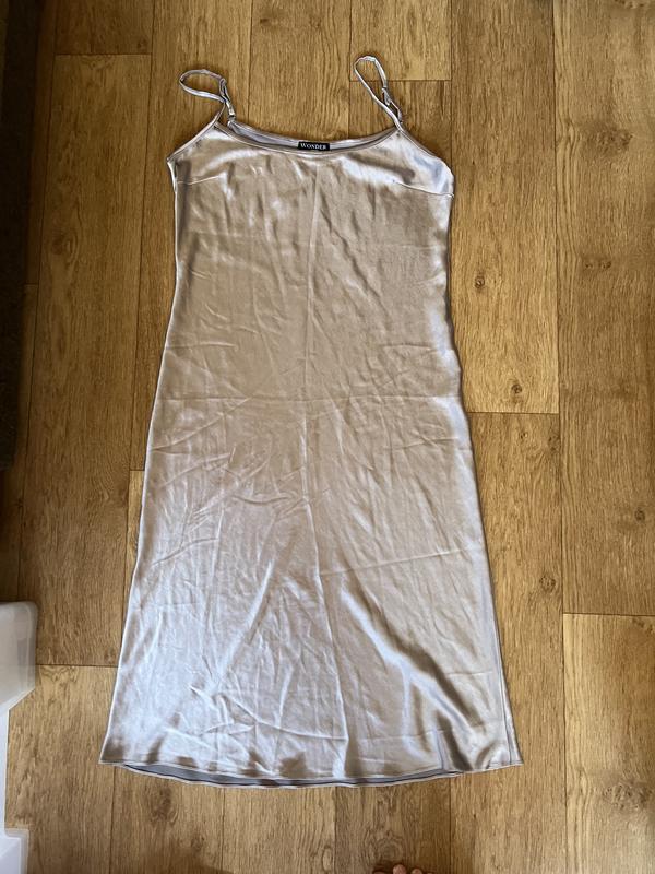 Вікова/поліестер (співвідношення не памʼятаю, стара колекція), але приємне до тіла. Нова, не вдягалась жодного разу. Але без бірки Довжина 123 ( з лямками) Лямки регулюються Груди -100 Талія -94 Бедра - 104
