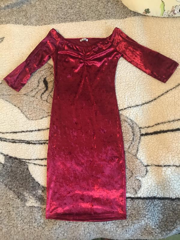 Сукня бордового кольору, плечі оголені, довжина сукні 90см, довжина рукава 37 см, розмір S
