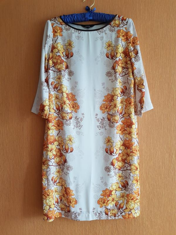 Яркое, нарядное платье прямого кроя на подкладке. Полиэстер, бирка с составом отсутствует. Рукав 3/4. Плечи 36, грудь 48, длина 90, рукав 41. Мягкая ткань с атласным отливом
