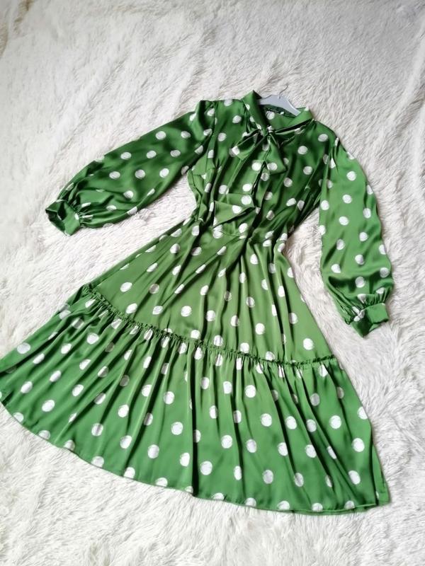 Шовкове плаття у великий горох із бантом воланами пишний рукав розміри 48-56
