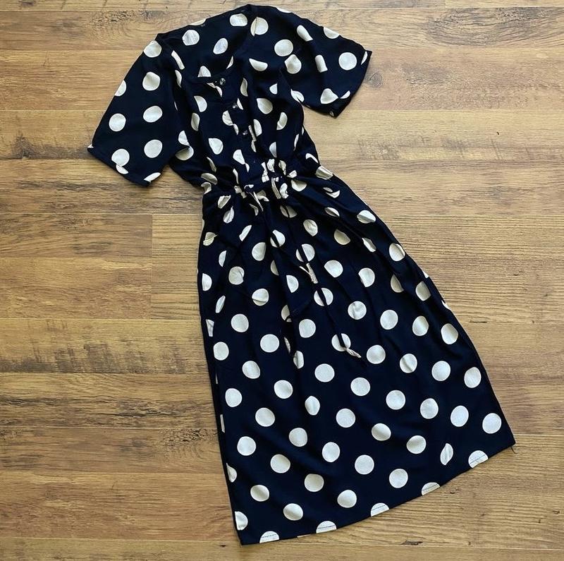 Темно-синя сукня у великий горох із приємної легкої тканини, бірки зрізані. З кишенями, на талії затягується поясом