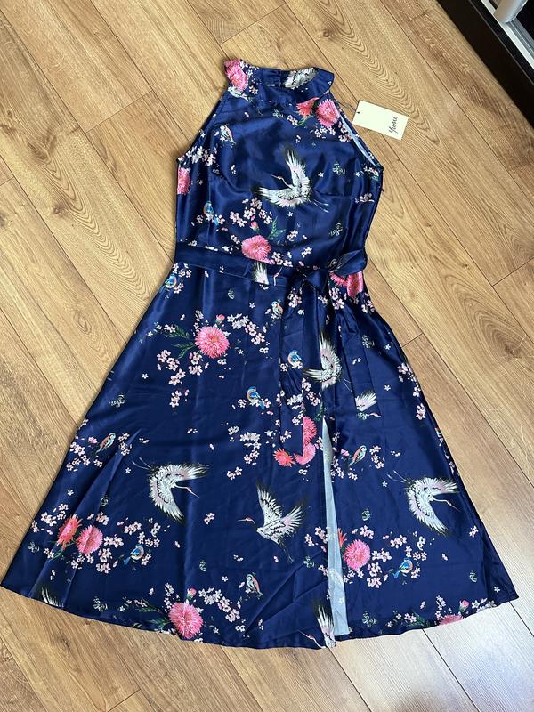 Сукня yumi з атласним принтом із журавликом з розрізом на нозі нова s