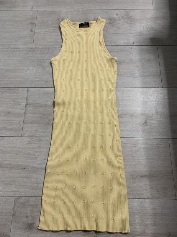 Блідо-жовте плаття в рубчик в квіточку.Bershka,розмір М.Довжина 80 см,ширина 27-50 см