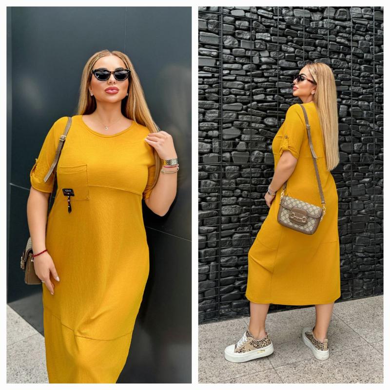 Сукня Тканина: лакоста літня ( добре тягнеться, не просвічується) Розміри: 48-50, 52-54, 56-58 Кольори: гірчиця, трава, джинс, моко, хакі. Заміри Сукня вільною крою, є бічні кишені. ********** ОС 122/130/138 Довжина 110 см MF