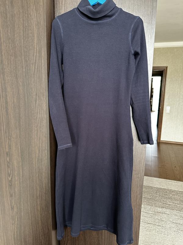 Сукня темно синього кольору, зверху гольфом, тягнеться розмір М, приталена, гарно підкреслює талію, в ідеальному стані, довжина 110см
