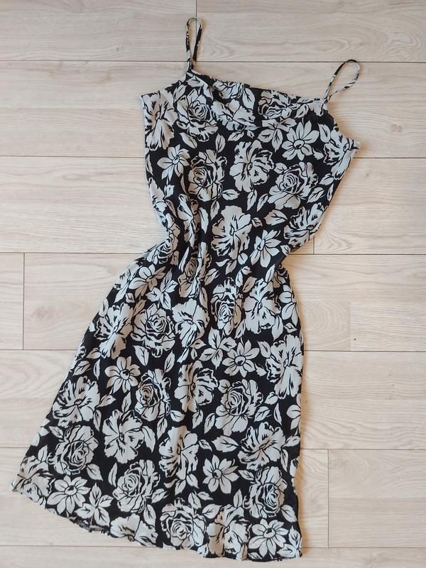 Сукня в чудовому стані. Дуже гарна та практична, з підкладкою, не просвічується. Сукня прямого крою, гарно сідає на фігуру. Заміри (в розтягненному стані) на останньому фото. Тканина добре тягнеться. Діє акція 1+1=3