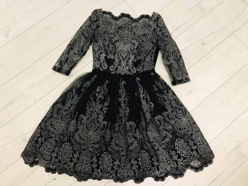 Пишне плаття з фатину на підкладці, збоку на потайній блискавці. Пошиття в кілька шарів надає пишності платтю, підкладка не дає просвіту. Дуже ефектна сукня. Принт вишитий з блискучих сріблястих ниток. можливий торг