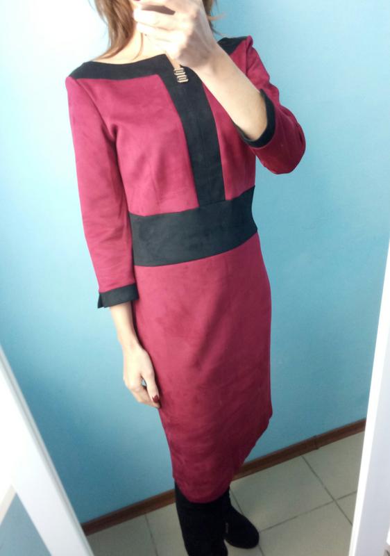Елегантне, приталені плаття з штучної замші, дуже приємне до тіла, сади шліца. Колір марсала з чорними вставками. Розмір 46/48 Довжина по спині 100см, про грудей 102-104, стегна 104-106см. Тканина тягнеться. Виміри в розкладеному стані.