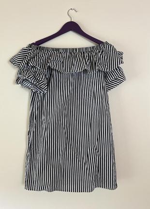 Плаття бюстье смугасте, є короткі рукава - можна носити як з спущеними плечима, так і у форматі футболки. 100% котон, довжина до коліна. Розмір S-M, сідає на плечах, нижче вільне - оверсайз.