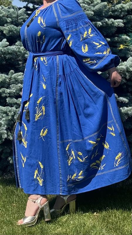 Сукню шили та вишивали на замовлення . Одягалася один раз. Підійде на розмір 50-52 . Гарно сяде на любу фігуру, також гарно буде дивитися на фігурі де плечі вузькі а бедра набагато ширші до 160 см обʼємом. На моделі ріст 162 см, 50 розмір.Без пояса до низу трапеція. Клатч і буси в подарунок.