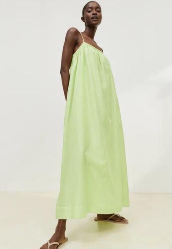 🌿салатовий сарафан H&M вільного крою з підкладом, брителі регулюються, тканина суміш льону Розмір:L Заміри:ПО грудей 48 см, довжина без бритель 115 см