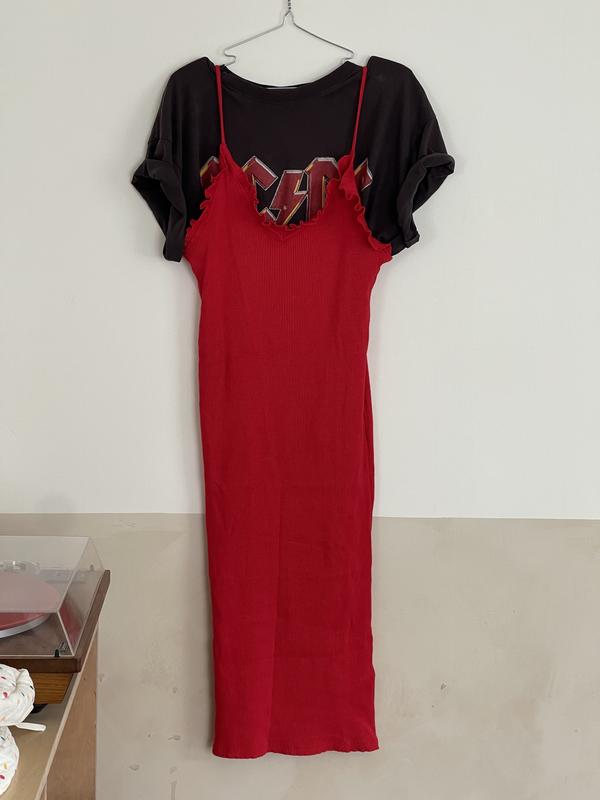 Стильне плаття, насиченого червоного кольору. розмір Л та підійде і на М. Добре тягнеться. Можна класно стилізувати і носити з чим завгодно.