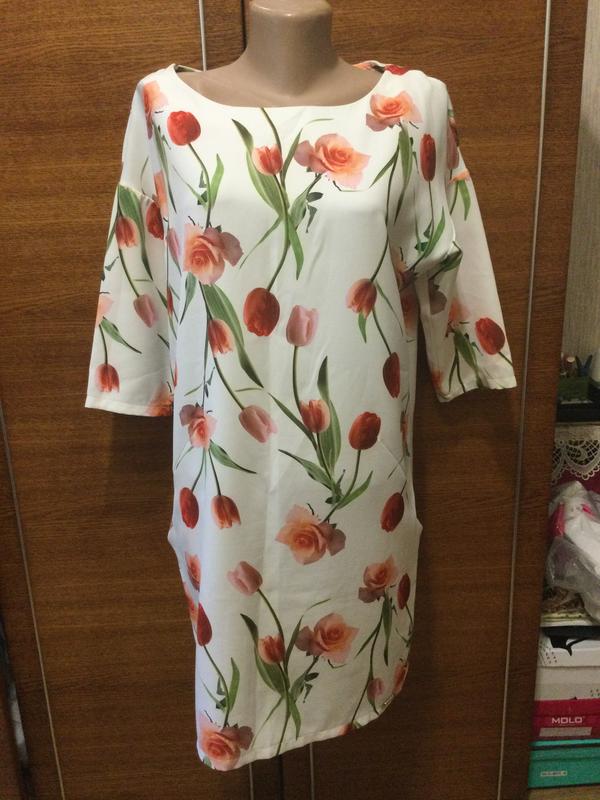 Дуже яскраві квіти. Бокові кишені. Прямий покрій , що сховає недоліки фігури. ПОГ - 52 см. Рукав- 28 см. Плече- 17 см. Довжина по спині- 82 см. Матеріал цупкий. Не жмакається. На бірці 38- це наш 44. Але по замірах воно і на 48-50 проходить. В ідеальному стані. Ні затяжок, ні плям.