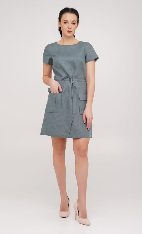 Сукня 100 % льон, в спортивному стилі,двічі вдягнена, в талії стягується шнурівкою,попереду накладні кишені.