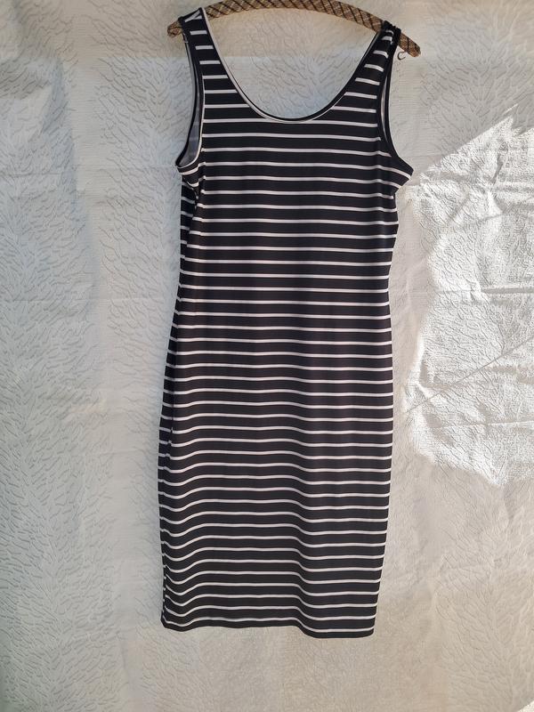 Плаття-майка у горизонтально полоску, темно-синього ,манжети чёрного кольору+білі полоси. Стан-ідеал. Тканина добре тягнеться, але краще на розмір Л(ОГ до 100 см,ОТ 80 см, ОС 100 см Розвантажую власну шафу. при покупці 2х речей -третя у подарунок(за найменшої вартості)