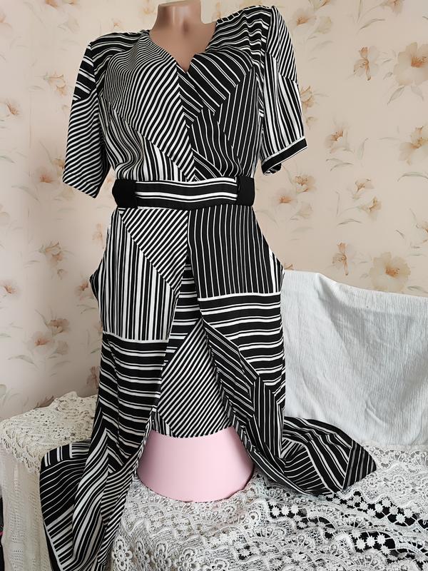 Шикарное брендовое оригинальное платье в чёрно-белый абстрактный рисунок. Двухслойная юбка. Соблазнительно открываются ножки. Сбоку на замке. Спереди два кармана. Прекрасно садится по фигуре. ПОГ-ПОТ-ПОБ 50-42-54 см. В плечах 40 см. Короткий рукав, длина от плеча 28 см . До линии талии от плеча 40 см., на запах. Нижняя юбка от талии 45 см., верхняя 84 см. Длина по спинке 124 см. Ткань НЕ тянется. Состояние новой вещи. Следы ношения отсутствуют. Дефектов нет.