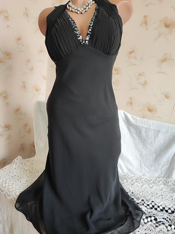 Изящное брендовое чёрное платье на бретелях, выполненное из мягкой эластичной ткани: открытая спинка, глубокий v-образный вырез спереди и слегка завышенная линия талии. Верх- прозрачный шифон, нижнее платье атласное с глянцем. Красивейшая драпировка лифа, соблазнительный вырез горловины. Сбоку на замке, отлично садится по фигуре. Лиф плотная чашка, украшен пайетками. Через шею драпированная шлея на двух пуговичках. Смотрится сногсшибательно, очень эффектно и стильно. ПОГ-ПОТ-ПОБ 46-42-52 см. Длина от плеча 110 см. Состояние новой вещи. Следы ношения отсутствуют. Дефектов нет.