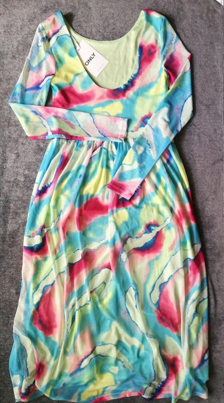 Продам полупрозрачное платье. Верх-разноцветная сетка, подкладка салатового цвета. Длинный рукав, V-образный вырез, завышенная талия на резинке.. Ширина плеча 37см, длина рукава 60см, ПОТ 35см, ПОГ 35см, ПОБ (приблизительный 65см) свободно, длина по спине 110см.