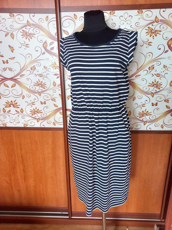 плаття з трикотажу (віскоза + cotton), в біло-синю смужку, з трикотажу середньої щільності, без нюансів, в ідеальному стані.довжина 100 ,ОГ 100,ОС 110, по боках кишені