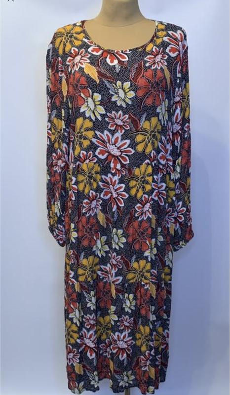 🌿🌿🌿Все цены установлены с учетом курса 15% торговой площадки «Шафа»🌿 ❗️❗️❗️ ❗️❗️❗️Покупая вещи в моей лавке вы подключаетесь к финансовой поддержке ЗСУ🇺🇦🇺🇦🇺🇦 Решительные действия вперед к победе🕊🕊🕊 Платье из ткани-жатки в яркаих цветах и мелкие пятнышки на черной основе,новое состояние, отрезное по талии, по низу широкая рюша, нежная по низу на резинке, очень современная и практичная в носке,размер указан 20/48, в сравнении с замерами👇👇👇 ✅По плечам 45 см ✅Пог 64 см тянется до 70 см ✅Пот 60 см ✅Поб 80 см ✅Длина 119 см,до шва 42 см ✅Рукав от шва 69 см, ширина по бицепсу 22 см Арт 4058