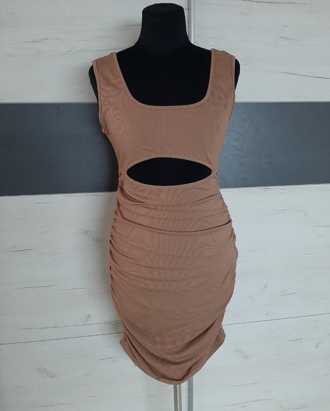 Трендова бежева сукня в рубчик зі зборкой міді плаття капучино розмір l uk 12