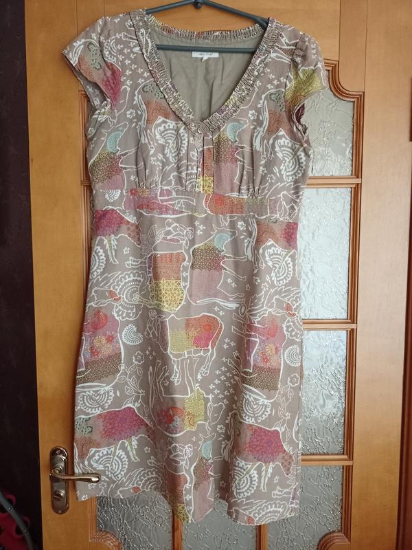 на подкладке в оригинальный принт размер 14 ПОГ 52 см, ПОТ 45 см, ПОБ 56 см, длина 98 см, рукав -12 см, плечо -6 см, сбоку молния 28 см. состав 54%- лен, 46 % - хлопок, подкладка - 100% хлопок
