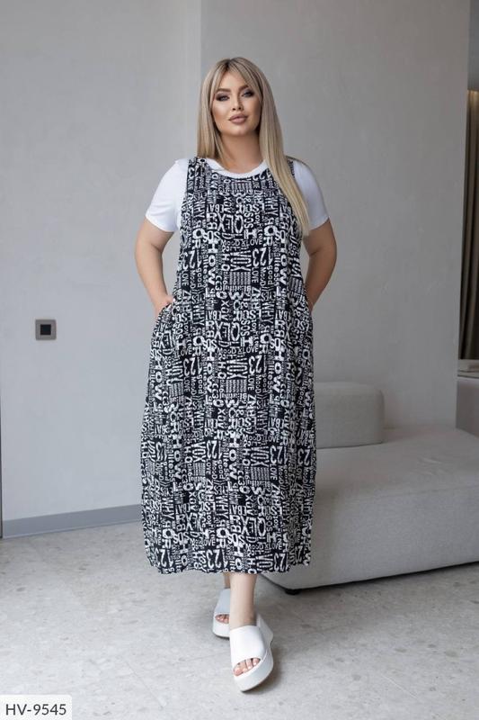 Сарафан HV-9545 код 1147 Розміри: 48-52, 54-58 Двійка сарафан + футболка Тканина: штапель, трикотаж 48-52: об'єм по проймі сарафана 130, довжина кофти 60, об'єм грудей кофти 110 см, Довжина сарафана 127см. 54-58: об'єм по проймі сарафана 138, довжина кофти 60, об'єм грудей кофти 120, довжина сарафана 127см.