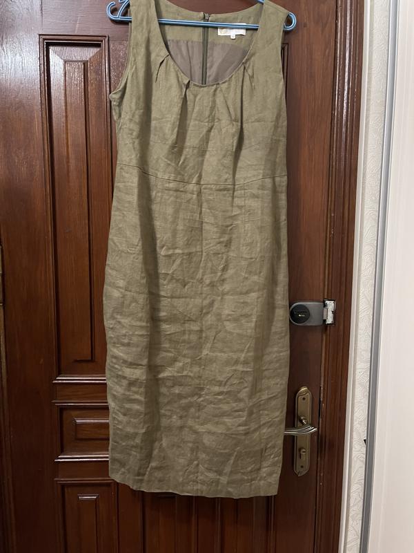Платье - миди, лён. Подкладка полиэстер. Цвет хаки. Размер 52, маломерит. Плечи 37 см, ПОГ 49 см, ПОТ 47 см, ПОС 57 см, длина до талии 38,5 см, общая длина 114 см, шлица 28 см. Стан идеален, без дефектов.