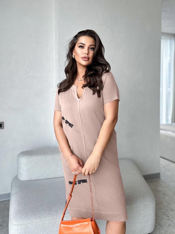 Трикотажна бавовняна сукня туніка міді бежева коричнева спортивна з коротким рукавом літ...