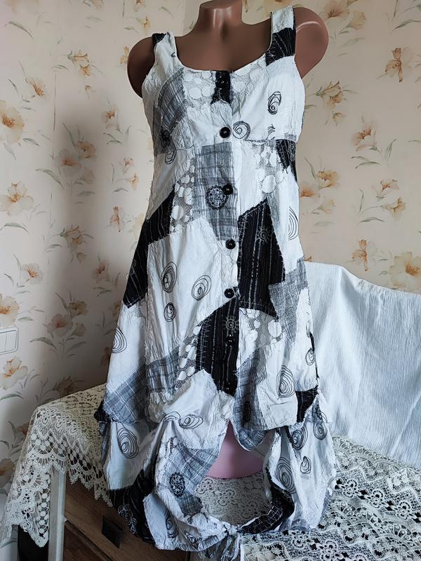 Брендове шикарне плаття оригінального пошиття. Має дуже ефектний та стильний вигляд. Відкриті плечі, глибокий виріз декольте. Попереду на ґудзиках. Тканина тонка, батист, комбінована зі шматків різної тканини та тонкого мережива. На підкладці до коліна. Стан ідеальний. Дефектів немає.