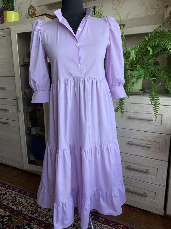 Сукня ніжного лавандового коліру розмір44-46 пог-46 пост- вільний (зборка) довжина рукава 3/4-44см ширина плечей- 34 довжина сукні-112 стан ідеальний тканина : бавовна 100% Розрахунок- при замовленні Укрпоштою передплата на карту продавця