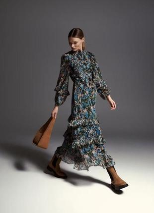 Гарне плаття з оборками.Комір стійка, пояс еластичний розмір хл, підйде і на Л. Одягнуте 1 раз, як нове. Гарно сяде на такі парметри талія від 76см, стегна від 100... Пог 55 см,талія 42( якщо меньше гарно під поясок). Довжина 133 см