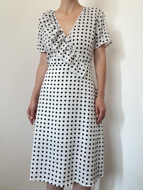 Сукня в горох Missguided Легкая, приятная к телу. Внизу есть подкладка. Стан - идеальный Размер M-L Замеры: полуобхват груди-50-53 см, полуобхват талии-40 см, полуобхват бедер-61 см, длина-106 см. Одето на размер S