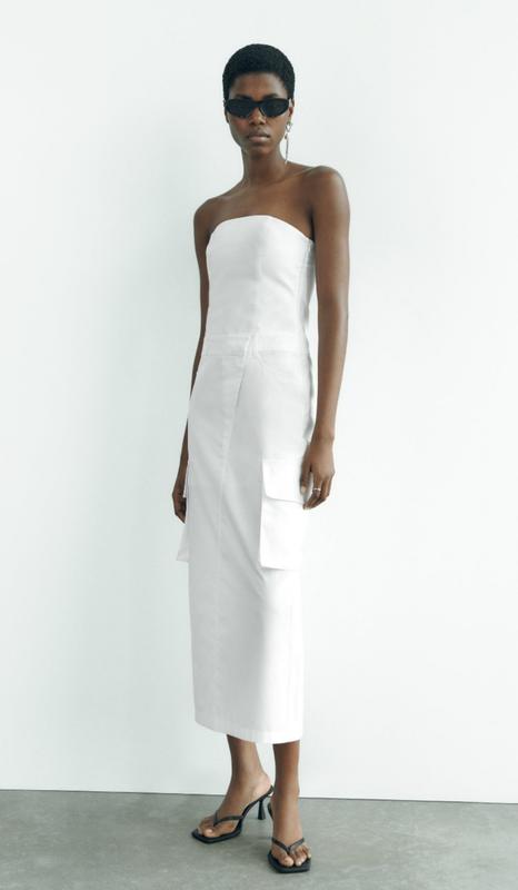 🌿100% котону в білому платті міді від Zara з накладними кишенями Розмір:S Заміри:ПО грудей в спокійному стані 38 см, талія 38 см, ПО бедер 50 см, довжина 113 см