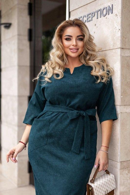 Плаття Тканина: мікровельвет Розмір: 48-50,52-54,56-58 Колір: капучино, синій, пляшка Заміри 48-50 Ог-112см ОТ — 108 см ОБ - 114см Довжина:107см 52-54 ОГ-118см ОТ -16см ОБ-120см Довжина -108см 56-58 ОГ-128см ОТ - 124см ОС — 122 см Довжина 110 см Сукня напів- приталеного силуету (з поясом), спереду фігурні накладні кишені ззаду розріз, конфігурна горловина. На моделі представлене плаття розміру 48-50!! про