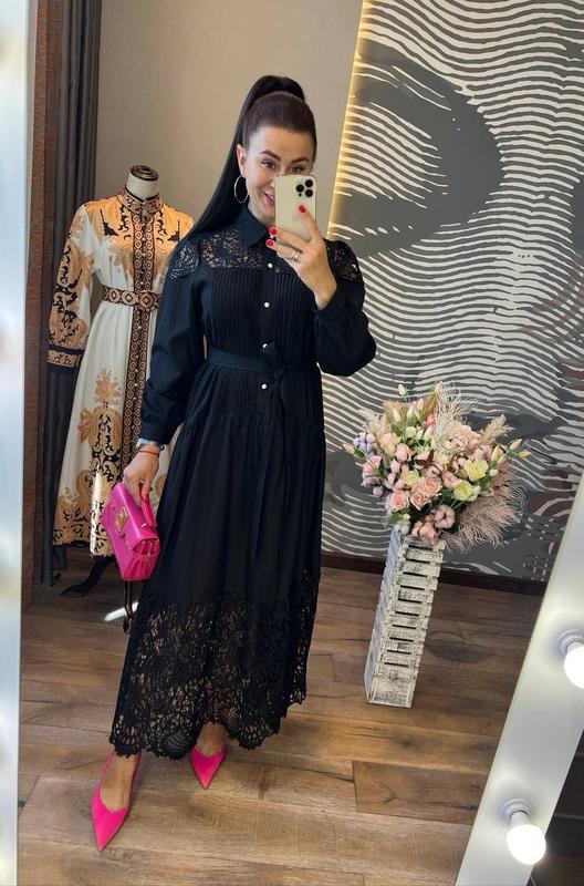 розкішна сукня вишуканого крою довжиною міді , виконана з високоякісного креп-котону і шикарного мережива, воно відмінно підійде для безлічі заходів, чи то весілля, чи то коктейльна вечірка, чи то сімейна урочистість сукня прямого крою , із заниженою та фігурно відрізною талією , в поєднанні з шикарною спідницею внизу, довгими рукавами на високих манжетах, витонченим відкладним коміром, ідеально виглядатиме на дівчатах з різними типами фігур сукня нереально красиво виглядає, вона безсумнівно займе гідне місце у вашому гардеробі і серці розмір 44-46 довжина 135 см, довжина рукава від шиї 70 см, о г по виробу 100-102 см, довжина від шиї до талії 51-52 см (спинка трохи нижча за передню частину) код 329 ціна 1850 грн