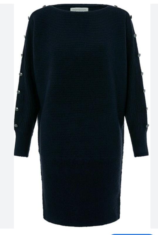Платье, темно синего цвета. Розмiр вказано М. Пог -62см. Пот-50см. Поб-47см. /резинка/. Длина -84см. Длина рукава отворота горловины 64см. Рукав летучая мышь. Декорован гудзиками . Склад акрiл-75%. полiэстэр22%, эластан 3%.