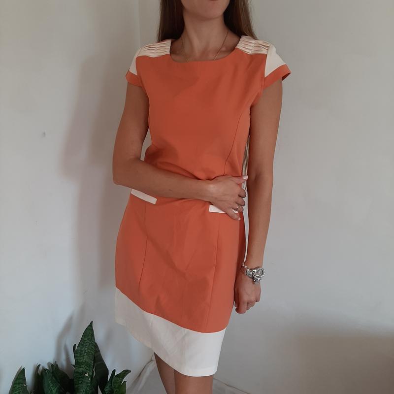 Хорошее офисное платье-миди оранжевое бежевое платье трендовое стильное