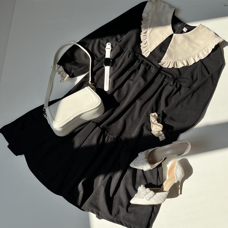 Нова сукня з комірцем у розмірі xs-s та м.. Чорна тканина ще тягнеться, комірець бежевого кольору. Заміри на останньому фото.