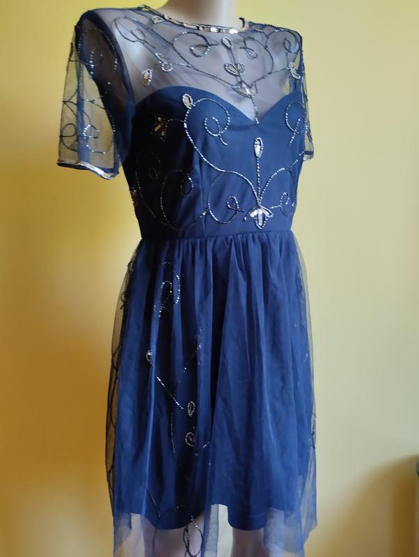 Сукня boohoo темно-синя з паєтками, бісером та фатином