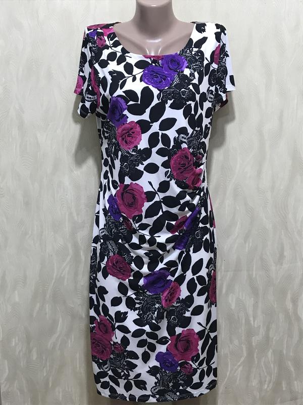 Сукня в принт квіти David Emanuel (Шрі Ланка), стан нового. Тканина масло, склад 96% поліестер, 4% еластан, тягнеться. Розмір написаний 16, дивіться виміри ПОГ 51-52см ПОТ 46-48см ПОБ 53-55см довжина по спинці від лінії плеча 102см Надсилаю Новою поштою, укрпоштою. 1473